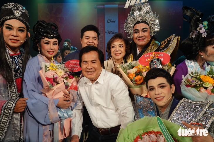 Nghệ sĩ Hoài Thanh (áo sơ mi trắng) và Đỗ Quyên (đứng cạnh nghệ sĩ Lê Tứ) chúc mừng học trò cưng Lê Tứ, Hà Như và các nghệ sĩ sau đêm diễn - Ảnh: LINH ĐOAN