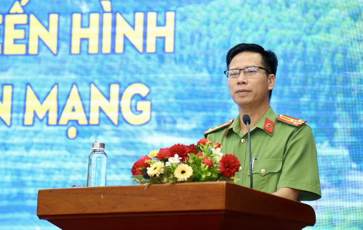 Thượng tá Trần Duy Kiên - Phó trưởng Phòng An ninh mạng và Phòng chống tội phạm sử dụng công nghệ cao Công an tỉnh Cà Mau - phát biểu tại hội thảo - Ảnh: THANH HUYỀN