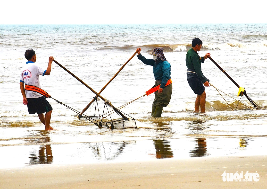 Sau mỗi chuyến cào bắt, người dân thu gom ốc tép cho vào bao tải xếp lên bờ biển để bán cho thương lái. Chỉ trong một ngày, lượng ốc tép người dân cào bắt được lên đến hàng chục tấn