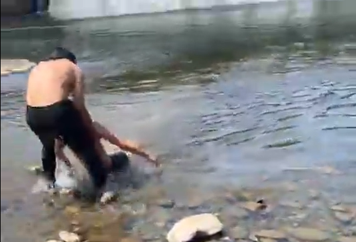 Khoảnh khắc anh Hà lao xuống nước đưa em L. vào bờ - Ảnh: Cắt từ clip