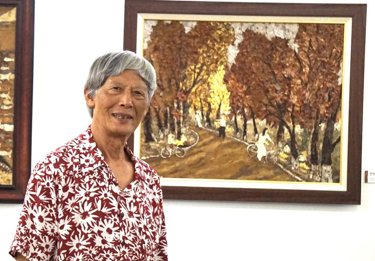 Ông Tạ Hải tại triển lãm Cuộc chơi của lá - Ảnh: T.ĐIỂU