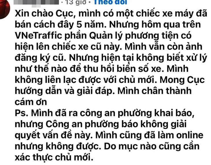 Cục Cảnh sát giao thông cũng nêu trường hợp cụ thể của anh T.Đ. về việc anh có một chiếc xe máy đã bán cách đây 5 năm. Đến nay khi kiểm tra qua VNeTraffic, anh Đ. vẫn đứng tên chiếc xe này. "Tôi không liên lạc được với chủ mới, không biết phải làm thế nào để thu hồi biển số xe", anh cho biết.