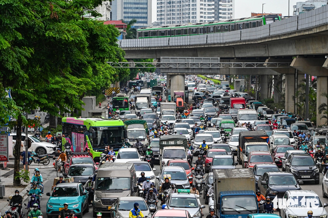 Từ đầu giờ chiều 24-4, nhiều tuyến phố tại Hà Nội có lưu lượng xe tăng cao - Ảnh: HỒNG QUANG