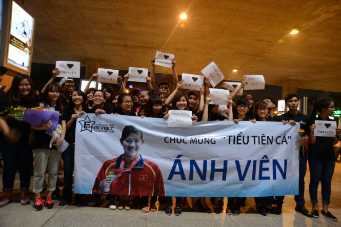 | CĐV mang băng rôn ra sân bay chào đón Ánh Viên. Ảnh: Duyên Phan |
