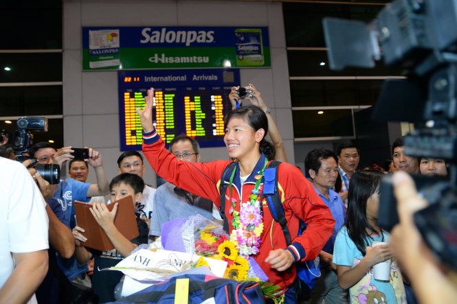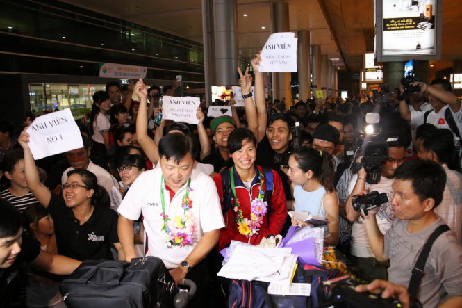 Phóng viên Hữu Khoa và Phan Duyên của Tuổi Trẻ đã ghi lại những hình ảnh khó quên đối với cá nhân Ánh Viên và thể thao Việt Nam tại sân bay Tân Sơn Nhất đêm 12-6: