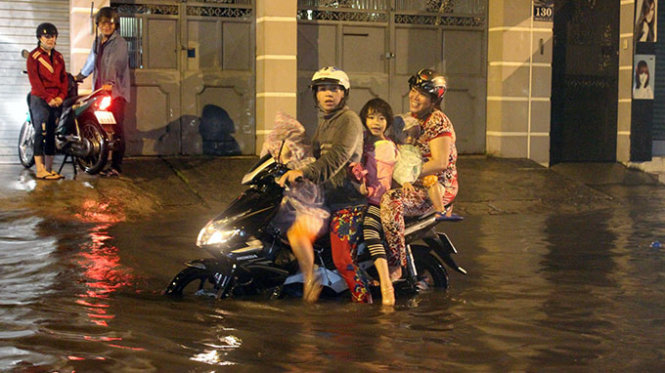 | Hai bà mẹ ba đứa con và chiếc xe chết máy giữa đường ngập lúc 0g - Ảnh: Đức Phú |