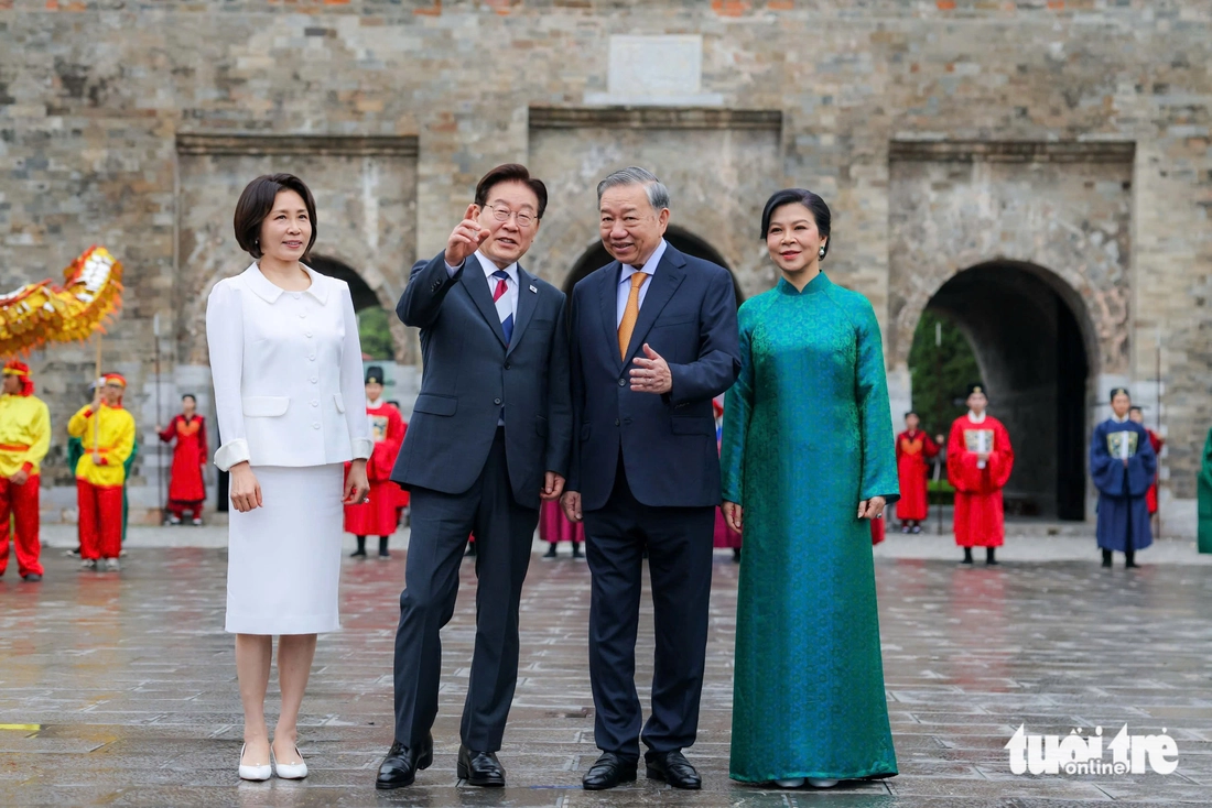 Tổng Bí thư, Chủ tịch nước Tô Lâm và Phu nhân Ngô Phương Ly cùng Tổng thống Hàn Quốc Lee Jae Myung và Phu nhân Kim Hye Kyung tại Đoan Môn - Ảnh: NGUYỄN KHÁNH