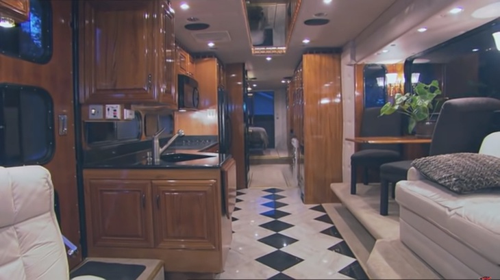Bên trong, “căn nhà” có đầy đủ tiện nghi với nội thất da và gỗ chủ đạo, nhà bếp đủ dụng cụ, giường đôi cỡ King, phòng tắm “xịn” như khách sạn. Phòng tắm có vòi hoa sen, bể sục, còn nhà bếp có đủ các thiết bị cần thiết trong cuộc sống hằng ngày như máy rửa chén, mặt tủ bếp bằng kính và lò vi sóng - Ảnh: CAMI