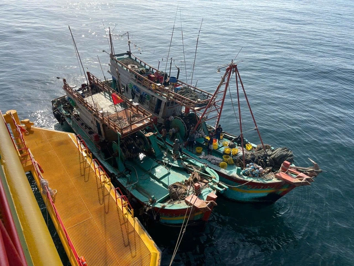 Hai chiếc tàu cá cập nhà giàn nhờ hỗ trợ cấp cứu ngư dân - Ảnh: VĂN ĐƯỜNG