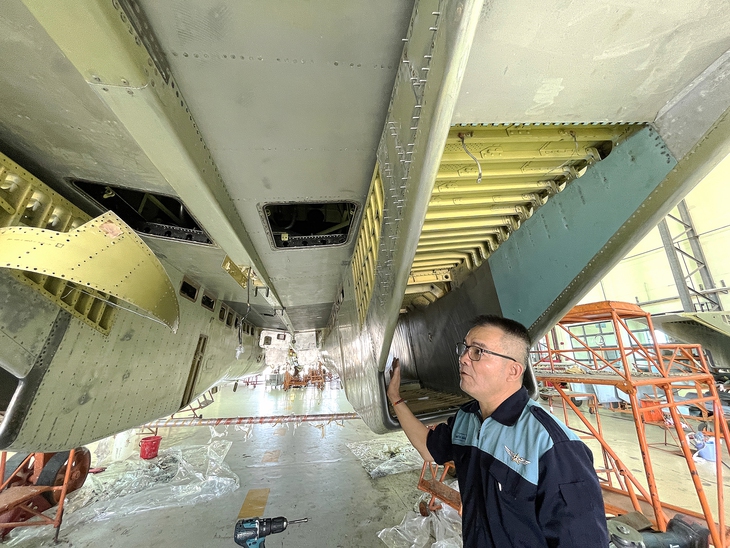 "Máy bay khi đến nhà máy thì việc đầu tiên là đánh giá tổng thể cấu kiện bên trong. Việc này phải làm bằng máy móc hiện đại và cũng có những việc phải làm bằng thủ công, thợ phải đi gõ từng vị trí, áp sát tai, rọi pin từng vị trí để coi các mối nối, khung xương còn đủ an toàn hay không.