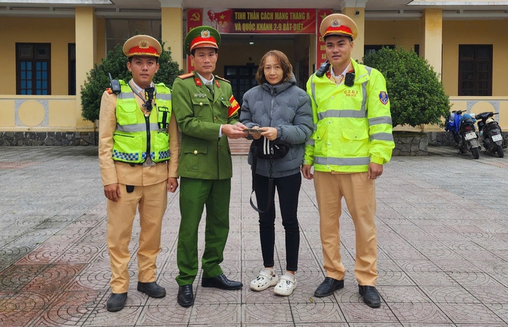 Đội CSGT Công an thành phố Huế cùng Công an phường Phong Thái trao trả lại chiếc túi xách có 23 triệu đồng của bà Ngô Thị Thảo Trâm đánh rơi - Ảnh: QUỐC BẢO