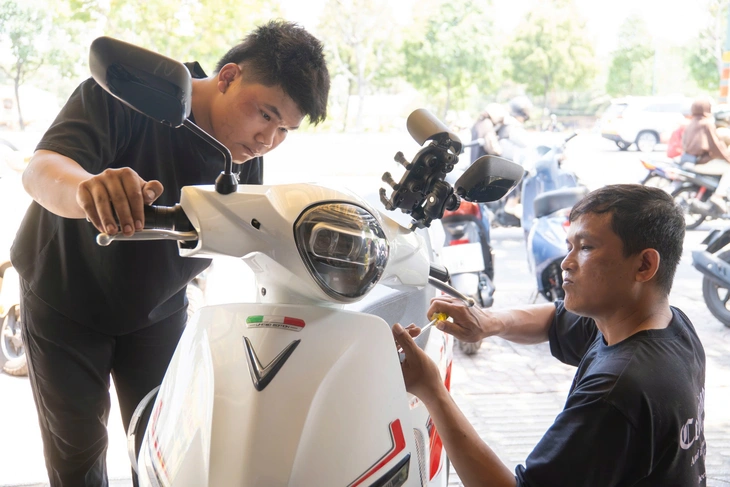 Bảo (bên trái) đi “làm đẹp” lại chiếc xe điện ba vừa mua cho mình chưa lâu - Ảnh: AN VI