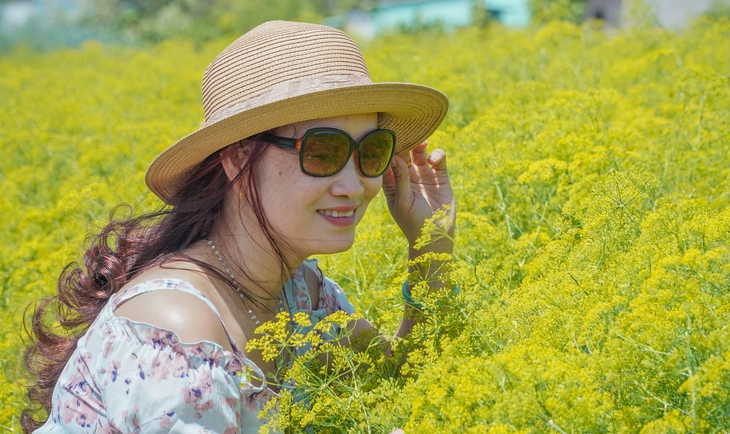 Giữa cái nắng nhẹ, những cánh đồng thì là với hoa bung nở, phủ sắc vàng trên diện tích rộng lớn. Những chùm hoa nhỏ li ti vươn mình trong nắng, tạo nên khung cảnh thơ mộng. Dưới nền trời trong xanh, sắc vàng của hoa làm nổi bật vùng quê, khiến nhiều người tranh thủ đến chụp ảnh lưu niệm.