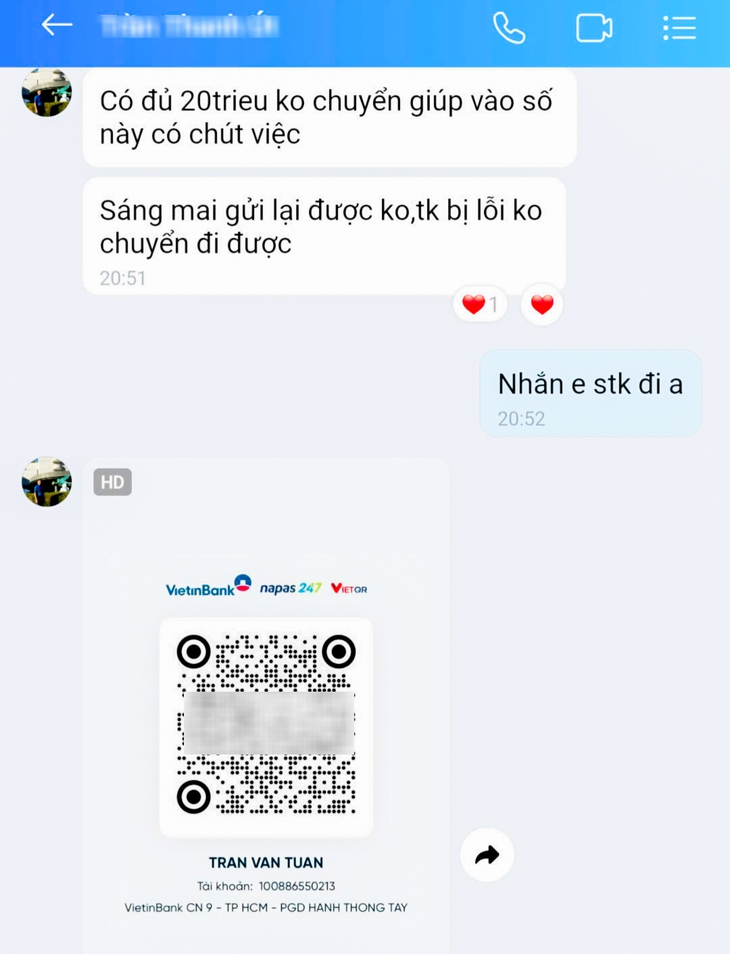 Để có thêm thông tin của người tình nghi, nhiều chủ tài khoản đã giả vờ "sập bẫy" để kẻ xấu gửi thông tin chuyển khoản rồi lưu lại, trình báo cơ quan chức năng. Đa phần tài khoản cung cấp thông tin chuyển tiền đều tên khác như: Dinh Thi Thu Hao, Tran Van Tuan…