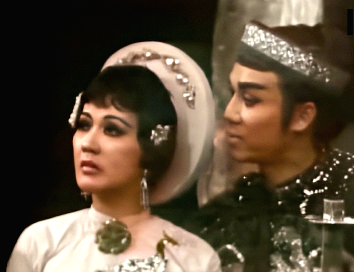 Hình ảnh của hai huyền thoại Thanh Nga, Thanh Sang trong vở cải lương Tiếng trống Mê Linh được phục chế bản màu - Ảnh chụp màn hình: LINH ĐOAN