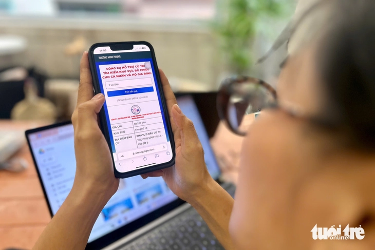 Người dân tra cứu điểm bỏ phiếu bằng số nhà trên công cụ hỗ trợ cử tri tìm kiếm khu vực bỏ phiếu của phường Minh Phụng - Ảnh: PHƯƠNG NHI