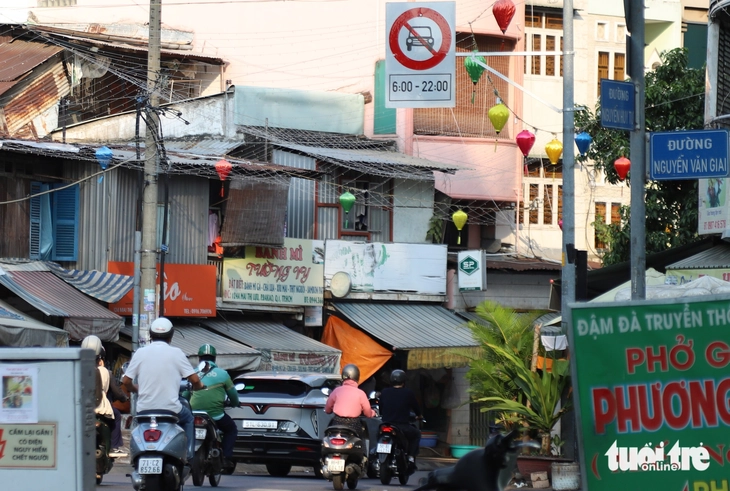 Nhiều tài xế vẫn chạy vào đường Mai Thị Lựu, phường Tân Định để ra đường Điện Biên Phủ dù có biển báo cấm theo khung giờ - Ảnh: NGỌC LÂN