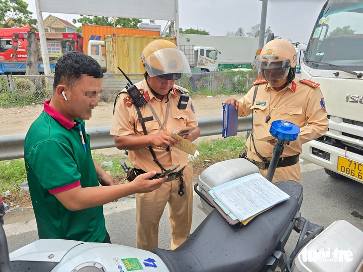 Tài xế N.B.K.L. bị cảnh sát giao thông lập biên bản vì dừng xe sai quy định, đoạn cuối đường dẫn cao tốc TP.HCM - Long Thành - Dầu Giây - Ảnh: MINH HÒA