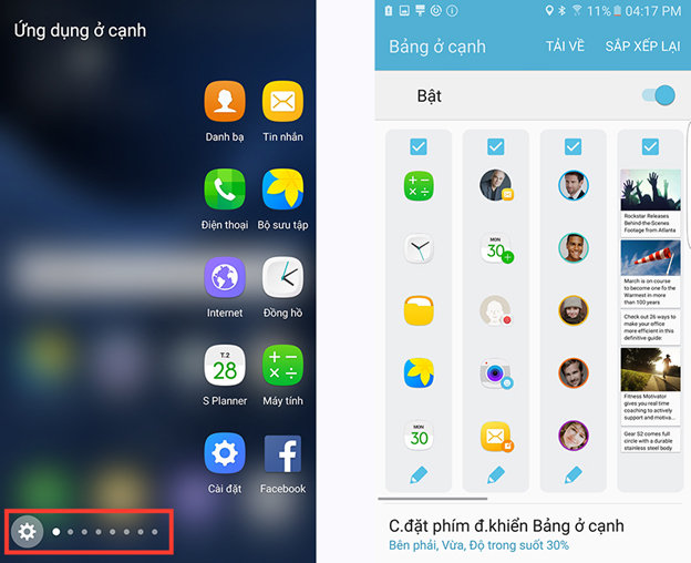 Ngoài những tinh chỉnh mặc định, bạn có thể tải về và cài đặt thêm nhiều tiện ích khác cho màn hình cong của Galaxy S7 edge bằng cách kích hoạt giao diện màn hình cong trên máy, nhấn vào biểu tượng cài đặt tại góc dưới bên trái rồi lựa chọn cho mình tính năng cần thiết để tải về.