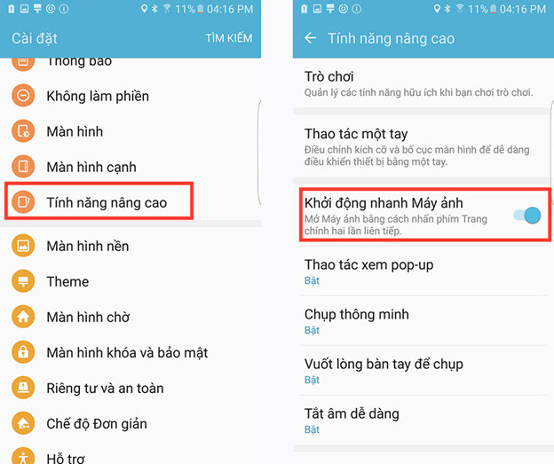 Để kích hoạt tính năng này, người dùng chỉ cần truy cập vào khu vực Cài đặt, tìm đến mục Tính năng nâng cao rồi chuyển tùy chọn “Khởi động nhanh máy ảnh” sang trạng thái ON.