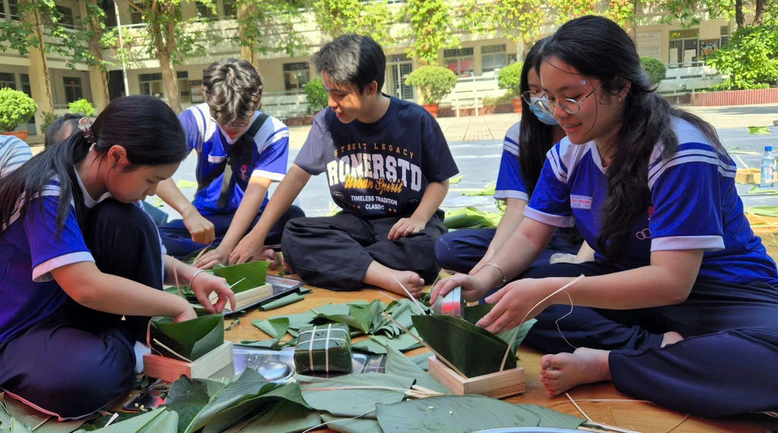 Ban tổ chức kỳ vọng tạo sự kết nối khi tổ chức cho học sinh và phụ huynh, giáo viên cùng nhau gói bánh chưng - Ảnh: H.H