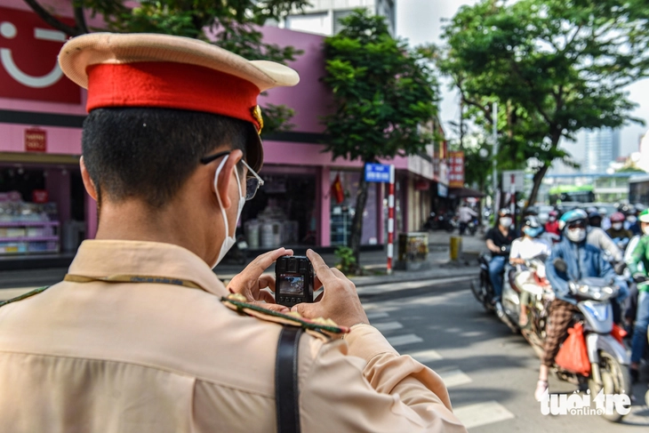 Cảnh sát giao thông sử dụng thiết bị nghiệp vụ ghi lại hành vi của tài xế vi phạm - Ảnh: HỒNG QUANG
