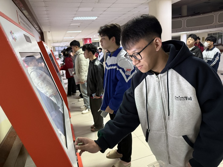 Thí sinh check-in tự động tại điểm thi đánh giá tư duy, sáng 24-1 - Ảnh: N.B.