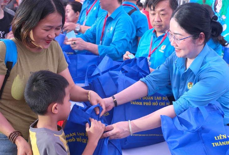 Bà Nguyễn Kim Loan, Phó chủ tịch Liên đoàn Lao động TP.HCM, trao quà Tết cho con em người lao động tại chương trình “Tết cho em” 2026 - Ảnh: VŨ THỦY