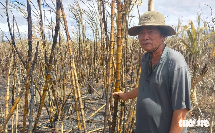 Ông Nguyễn Văn Niệm thẫn thờ bên ruộng mía gần 2ha bị cháy đen - Ảnh: ĐỨC CƯỜNG