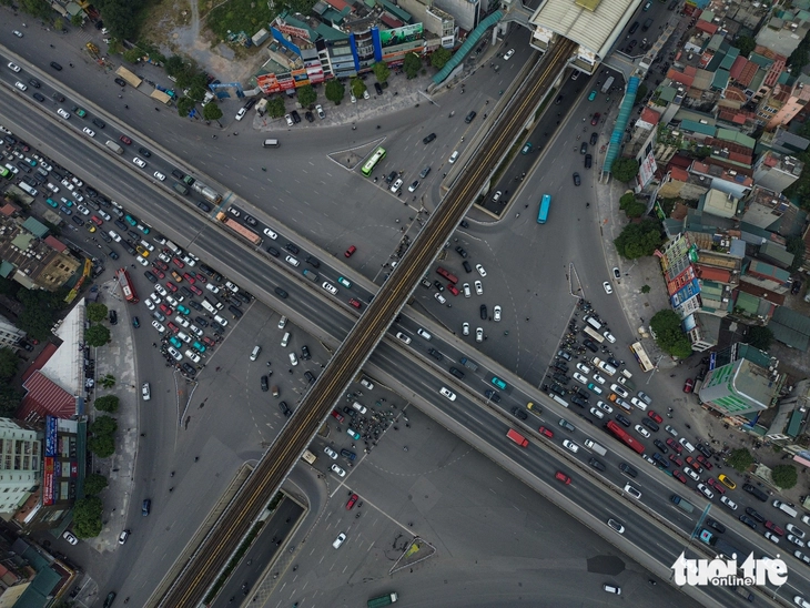 Ùn ứ xảy ra trên trục Nghiêm Xuân Yêm, nhưng khi đèn tín hiệu chuyển sang đỏ, toàn bộ xe đều dừng lại đúng vị trí