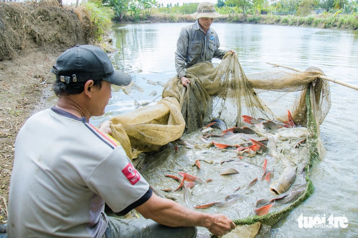 Vừa thu lưới bắt cá giao khách, ông Lê Văn Cương (58 tuổi, trú xã Hòa Phú) không giấu được niềm vui. Hơn 20 năm gắn bó với nghề nuôi cá lăng, ông hiện có hai ao với tổng diện tích hơn 4 sào, xuất bán quanh năm.