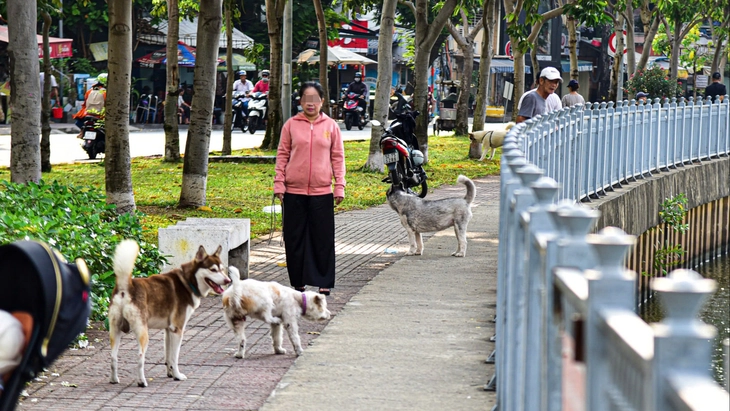 Chó không rọ mõm được chủ dẫn đi "dạo" dọc bờ kè kênh Nhiêu Lộc (TP.HCM) - Ảnh: TRÍ ĐỨC