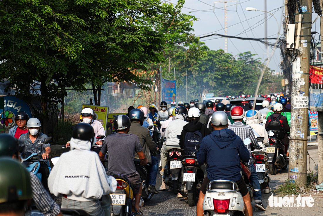 Đường Lương Ngọc Quyến ùn ứ vào giờ cao điểm sáng 22-4, phía xa là khói bốc lên từ những bãi đốt rác tự phát, nằm gần đường ray