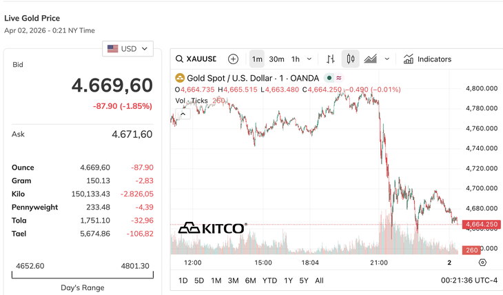 Giá vàng thế giới rơi mạnh hôm nay - Ảnh chụp màn hình