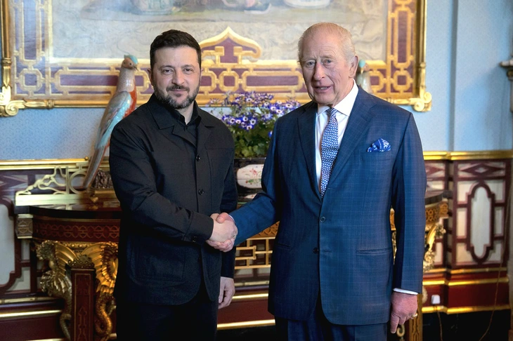 Vua Charles III của Anh (phải) bắt tay với Tổng thống Ukraine Volodymyr Zelensky trong buổi tiếp tại Điện Buckingham ở London, Anh ngày 17-3 - Ảnh: AP