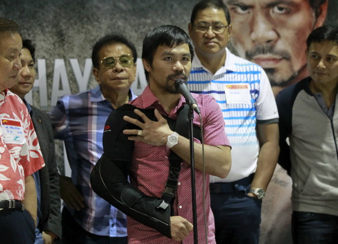 Pacquiao xuất hiện với cánh tay phải đeo băng. Anh nói với các phóng viên rằng, anh vẫn chưa xác định tương lai sau trận thua đau đớn trước Mayweather ngày 3-5. “Trước hết tôi sẽ tập trung chữa lành vết thương ở vai. Sau đó, tôi sẽ công bố quyết định tiếp tục sự nghiệp hay nghỉ hưu” - Pacquiao cho biết.