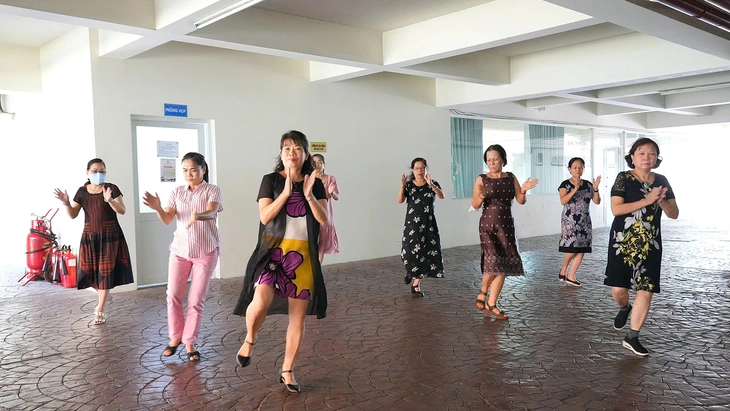 Các cô trong đội văn nghệ chung cư Sky Garden, phường Tân Phong, tập luyện trước tiên để rèn luyện sức khỏe và biểu diễn vào những dịp lễ - Ảnh: HỮU HẠNH