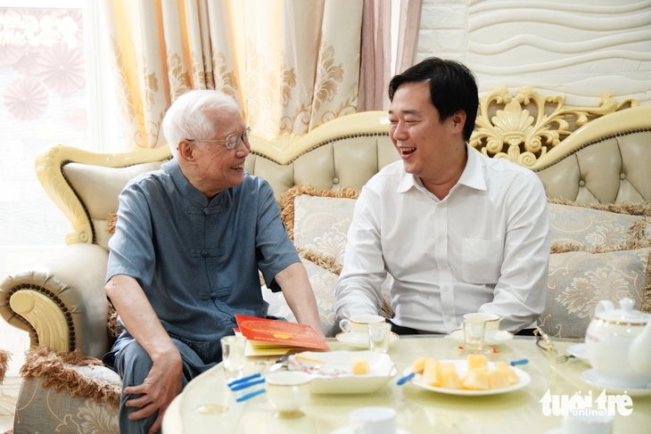 Trong không khí ấm áp, thân tình của ngày 26 Tết, ông Lê Quốc Phong ân cần hỏi thăm tình hình sức khỏe, cuộc sống của ông Ngô Kế Sương và gia đình - Ảnh: KỲ PHONG