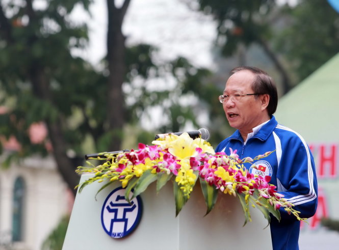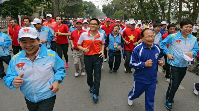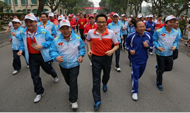 Phó thủ tướng Vũ Đức Đam (thứ 3 từ trái) và bộ trưởng Bộ VH-TT-DL Hoàng Tuấn Anh tham gia ngày chạy. Ảnh: Việt Dũng |