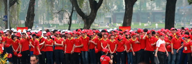 Sắc đỏ tràn ngập đường phố Hà Nội trong ngày chạy Olympic. Ảnh: Nam Khánh |