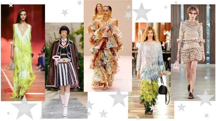 Sàn catwalk mang màu sắc mơ mộng của Chloé trình làng các mẫu áo corset hoa và những chiếc áo, váy được nhún xếp tinh tế, trong khi người mẫu của Moschino diện các bộ đồ hai mảnh nhún bèo, nhiều tầng với cách phối màu tương phản mạnh.