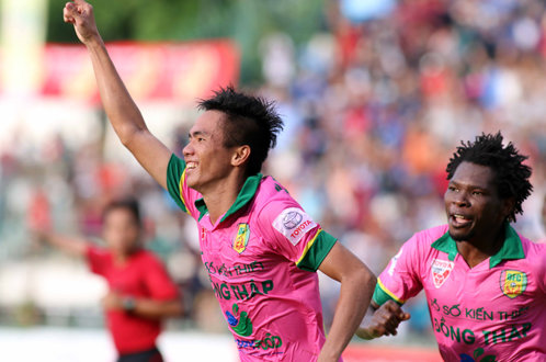| Niềm vui của Nguyễn Đồng Tháp sau khi ghi bàn vào lưới HAGL. Ảnh: N.K |