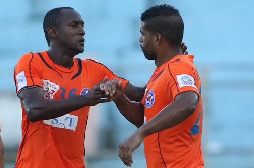| Niềm vui của các cầu thủ Đà Nẵng sau khi ghi bàn vào lưới ĐTLA. Ảnh: Thắng Lê |