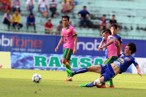 | Tuấn Anh (áo xanh) nỗ lực ngăn chặn pha đi bóng của các cầu thủ Đồng Tháp. |