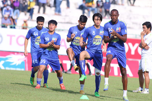 | Các cầu thủ HAGL khởi động trước trận đấu. Ảnh: N.K |