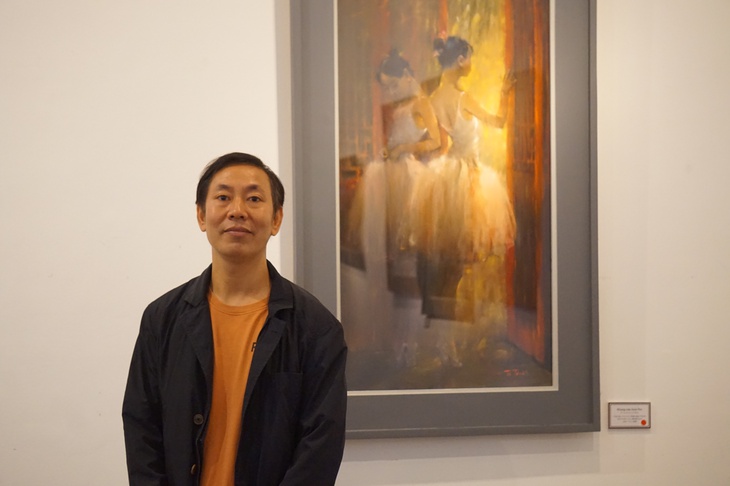 Họa sĩ Nguyễn Trọng Tài và một bức vũ công ballet tại triển lãm Hồi Quang phản chiếu - Ảnh: T.ĐIỂU
