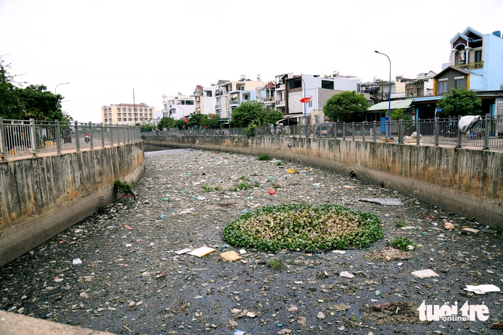 Rác thải sinh hoạt, bao ni lông... nổi lềnh bềnh ở kênh Nước Đen - Ảnh: NGỌC LÂN