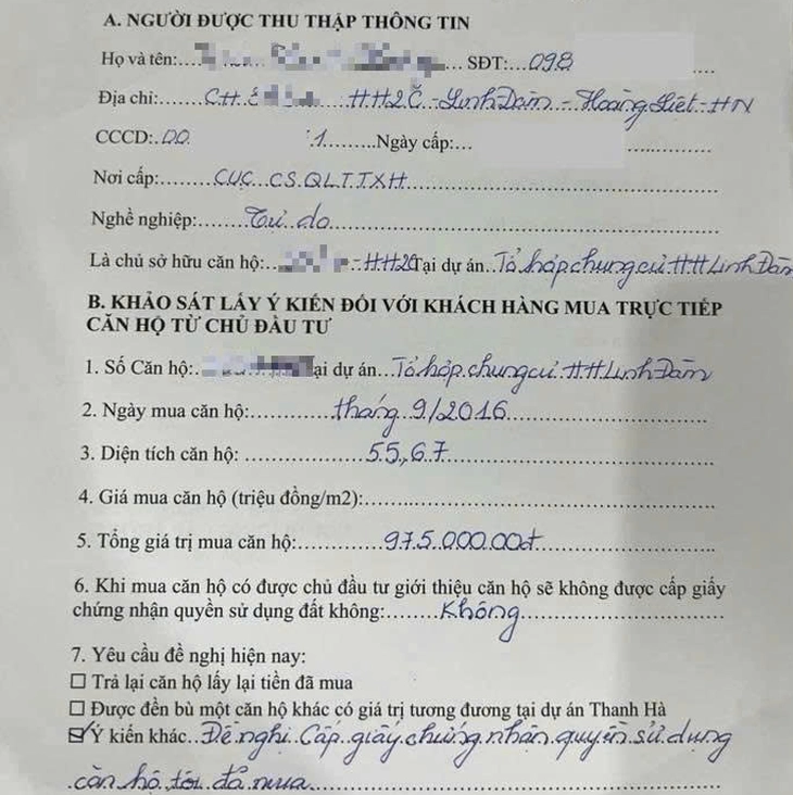 Trong phiếu thu thập thông tin, phương án chính được đưa ra gồm trả lại nhà tại HH Linh Đàm và lấy lại tiền, hoặc được đổi sang căn hộ khác có giá trị tương đương tại Khu đô thị Thanh Hà.