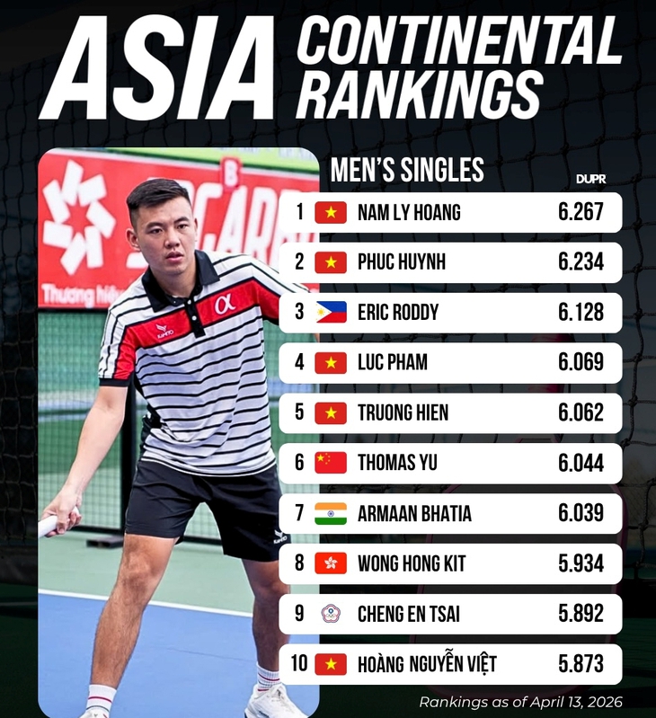 Sau chức vô địch đơn nam PPA Asia - Hanoi Cup 2026, Lý Hoàng Nam đã tăng điểm trình độ pickleball của mình lên 6.267 và dẫn đầu bảng xếp hạng DUPR khu vực châu Á trong tháng 4.