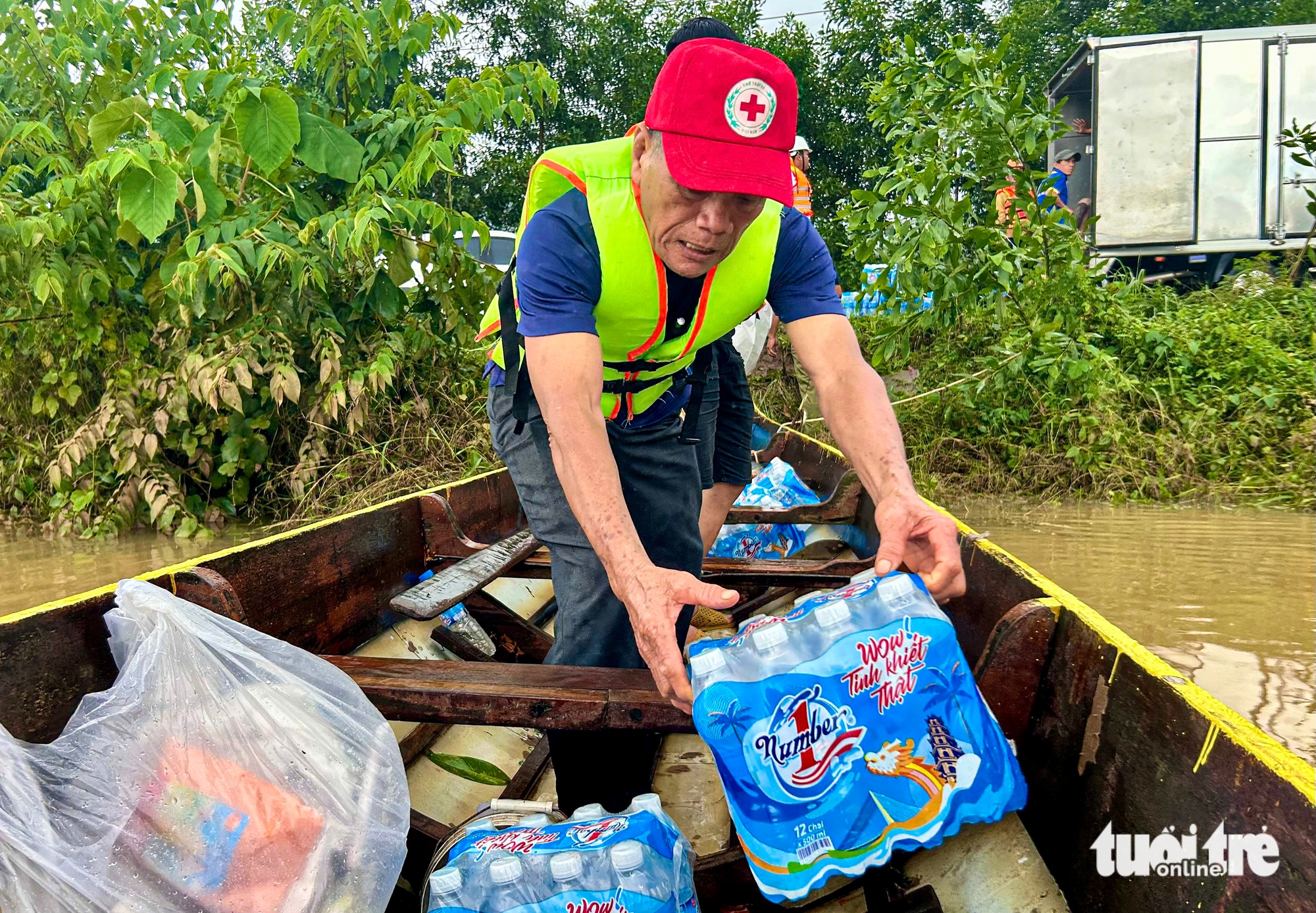 Những ngày qua, nhóm thiện nguyện của ông Nguyễn Văn Tám vận chuyển các chuyến hàng vào cứu trợ cho bà con thôn An Lợi Tây - Ảnh: THANH NGUYÊN